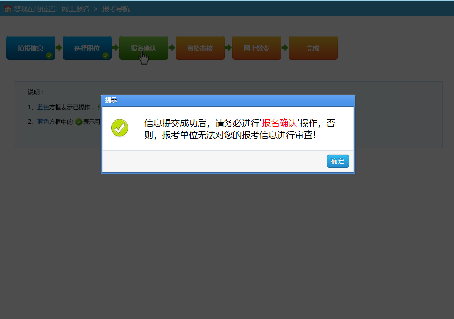 报名确认后,到报名截止时间前,请及时关注是否通过资格初审,已通过资格初审的不能再报其他岗位,未通过资格初审的考生根据审核未通过意见,可在报名时间内如实准确地修正完善报名信息后再次报名或改报其他符合条件的岗位,并接受资格初审。
