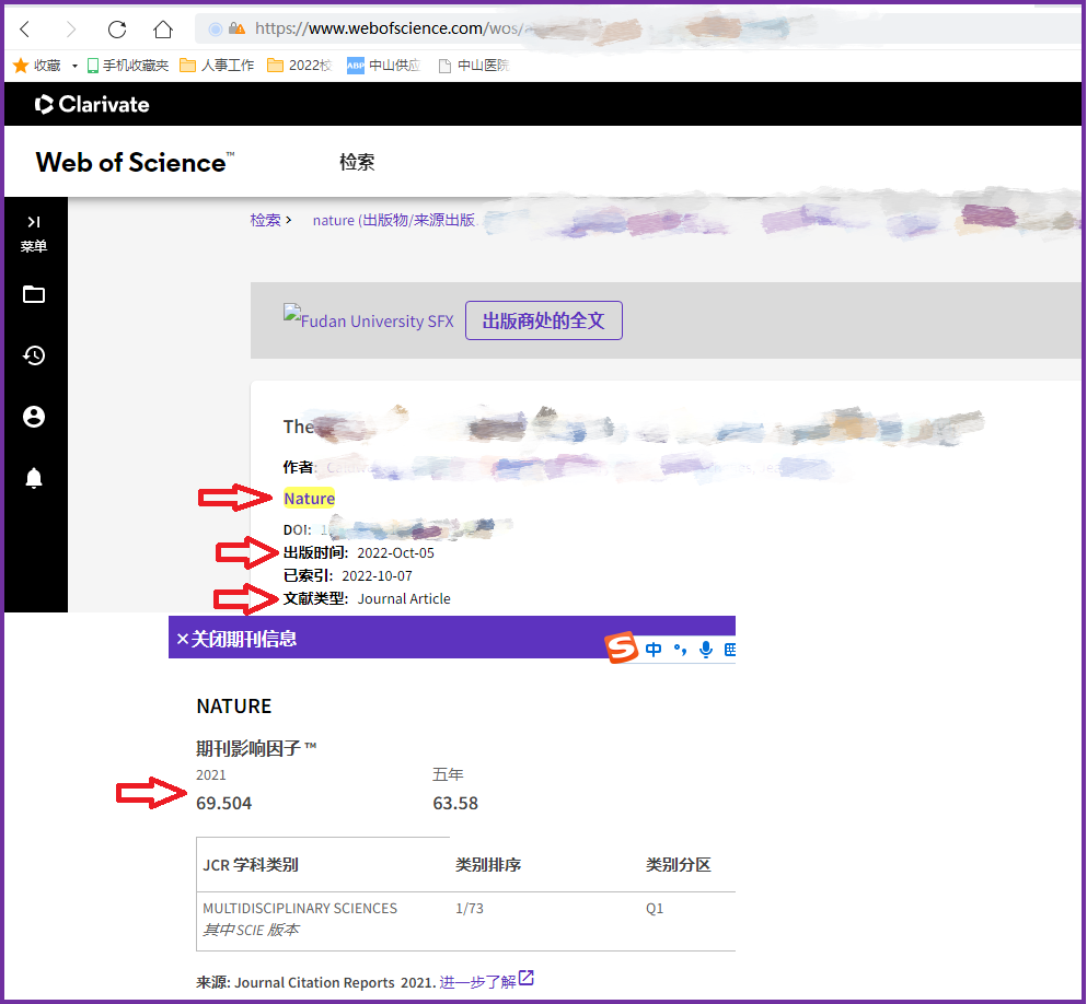 5、第一作者/通讯作者发表论文(附件上传封面、目录和全文),论文发表截止日期2023年5月24日;所有第一作者/通讯作者SCI论文,SCI论著另请附件上传查询截图(包含文章见刊年的影响因子分值+文章类型+见刊时间)。*SCI论著未上传附件查询截图,不做认定。查询截图样图: